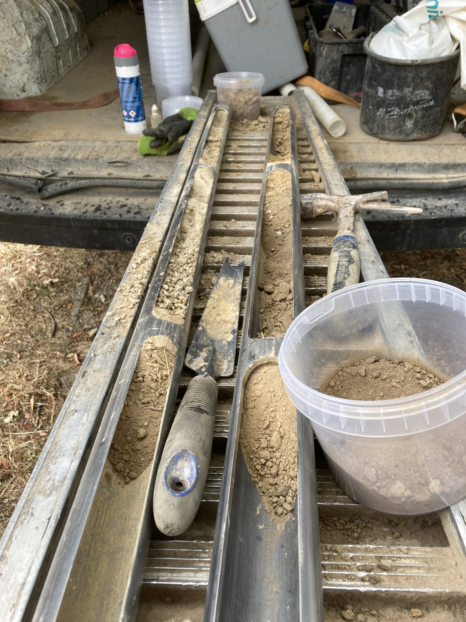 Vor Baubeginn werden unterschiedliche Untersuchungen durchgeführt. Hierzu zählen die Baugrunduntersuchung und die Kampfmitteluntersuchung. Links die Aufnahme einer Rammkernsondierung zur Erfassung der Schichtenfolge des Untergrundes.