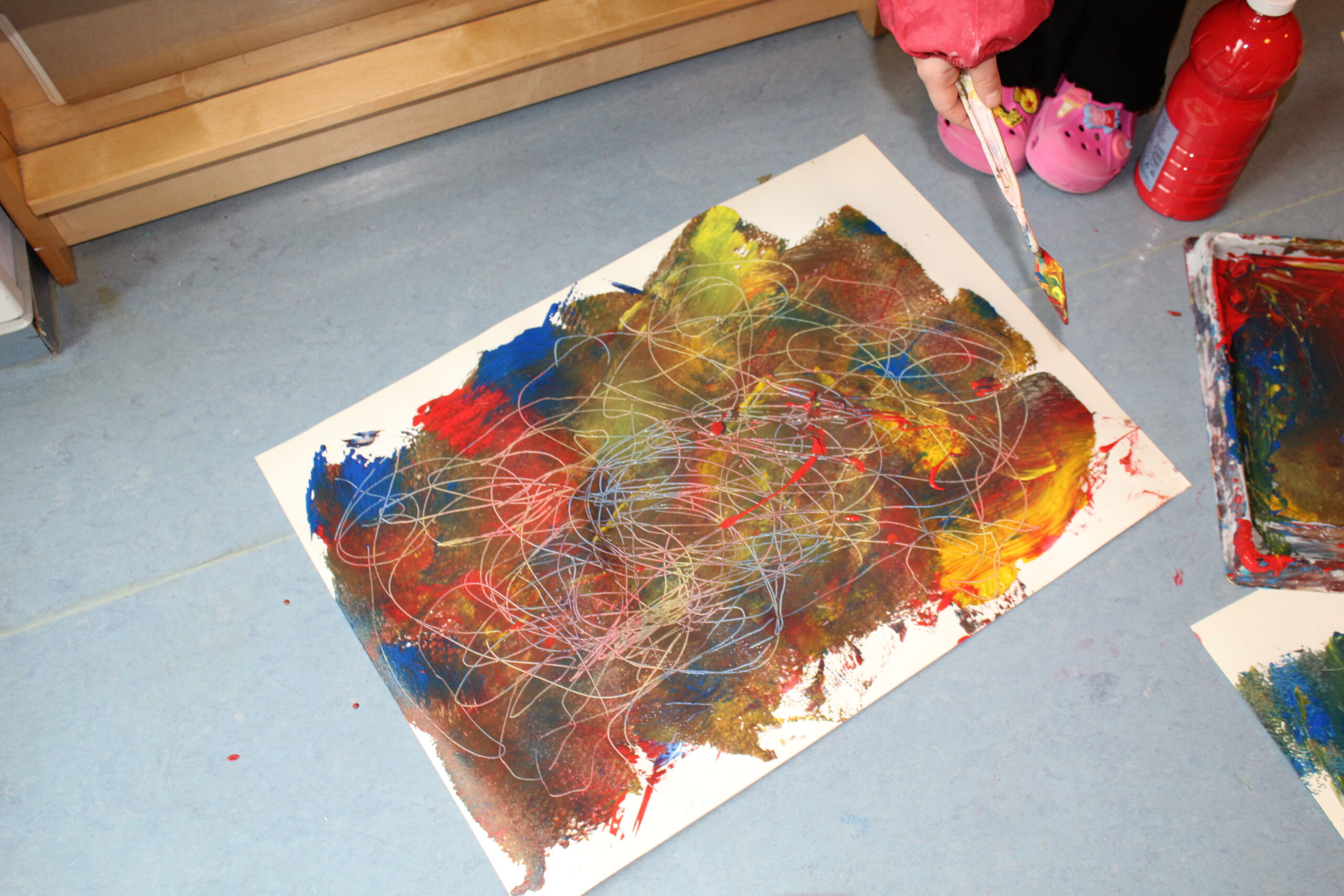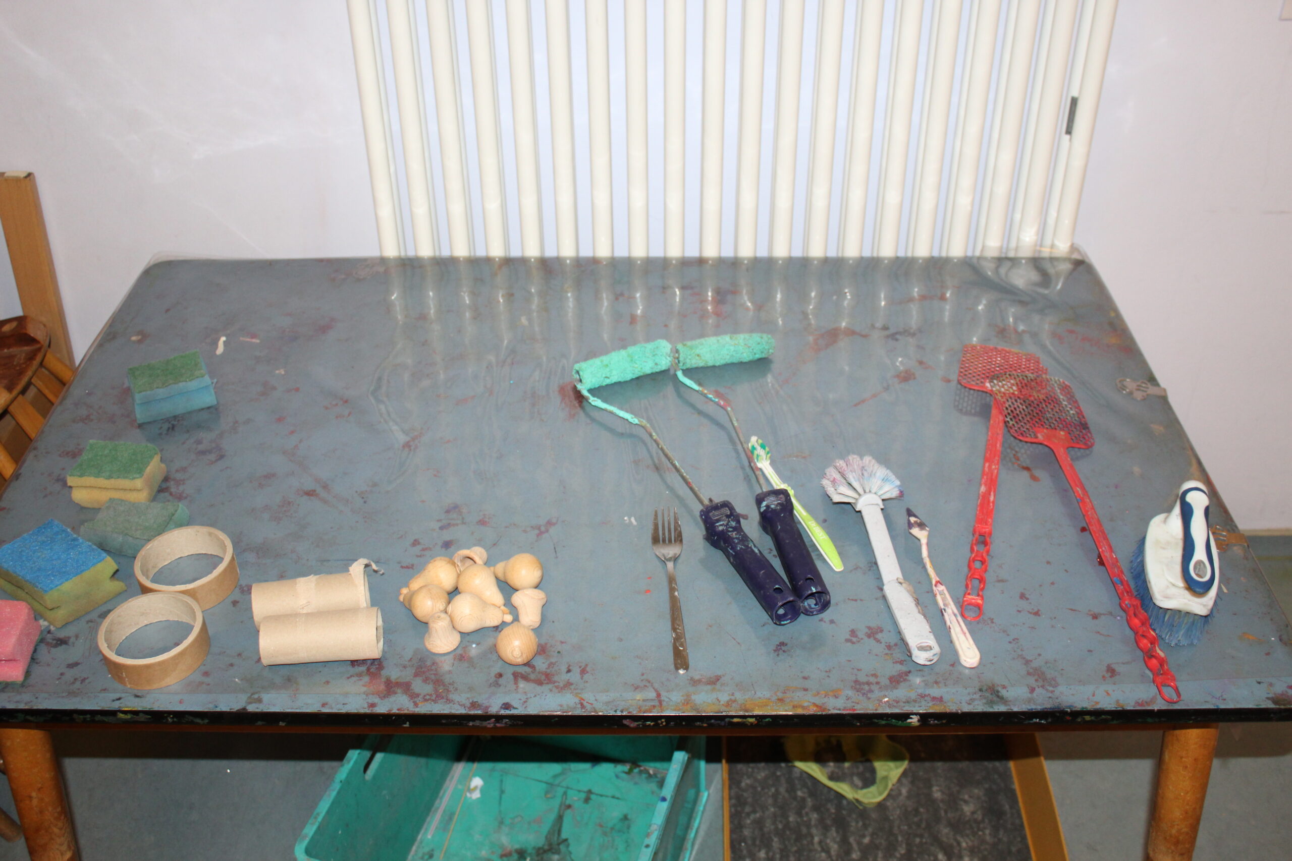 Am zweiten Vormittag ging es dann richtig zur Sache: Auf dem Boden haben wir mit nur drei Farben und sehr ungewöhnlichen Materialien große Bilder gemalt. Zur Auswahl standen Schwämme, Bürsten, Spachtel, Stäbe, Rollen und sogar Fliegenklatschen.